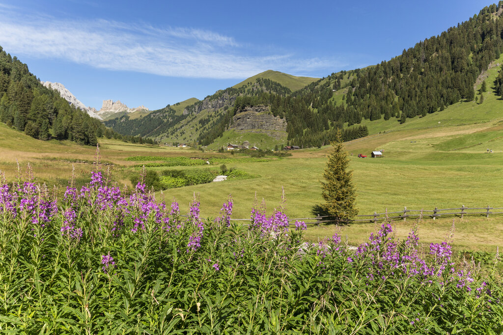 Von Campitello steigt man in Richtung Duron Tal auf, einem prachtvollen Pflanzen- und Kräutermeer, das von Hütten und dem kristallklaren Wasser des gleichnamigen Baches gesäumt wird.