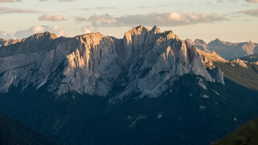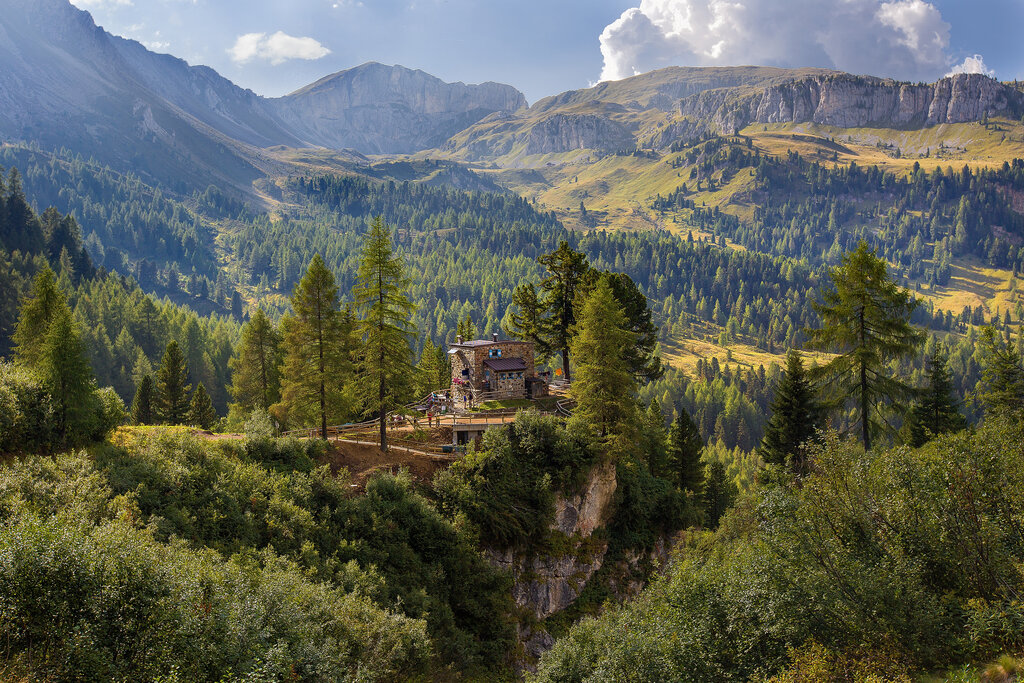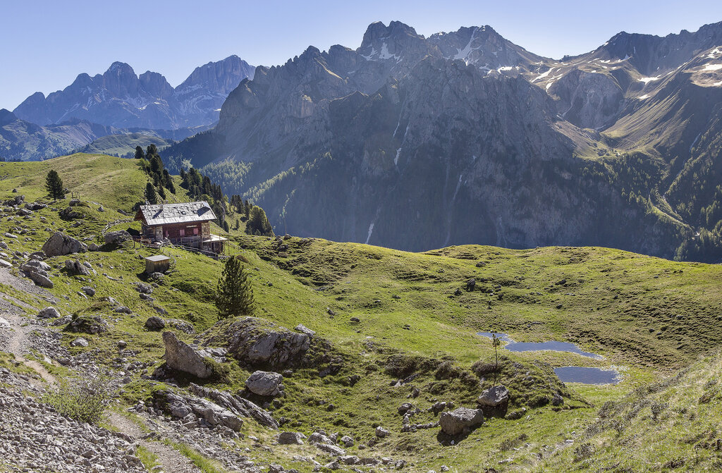 Nach der Kapelle des Kruzifixes oder, wie die Fassaner sie nennen, der "Ciapela de la Mont de Pozza", erreicht man die Straße, die mit teilweise steilen Anstiegen durch den Wald führt. Anschließend folgen Weiden, so weit das Auge reicht, ein paar vereinzelte Hütten und eine einzige Almhütte. Atmen Sie die reine Luft ein, genießen Sie die Stille, bewundern Sie die Freiheit der Kühe, Esel und Pferde, die hier glückselig grasen, und lassen Sie sich von der Energie der Natur mitreißen! Wenn Sie möchten, endet Ihr Ausflug bereits hier mit einer Einkehr in einem Bergbauernhof, wo Sie sich mit wirklich typischen Gerichten verwöhnen lassen können. Von der Monzoni Alm geht es weiter zur Vallaccia Hütte, auf die Gipfel Cima Undici (Elferspitze) und Cima Dodici (Zwölferspitze), zum Lagusel See oder zur Taramelli Hütte und zum Selle Pass im San Pellegrino Gebiet.