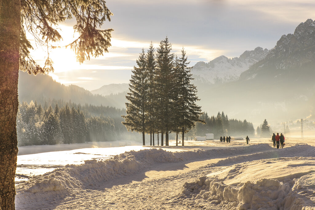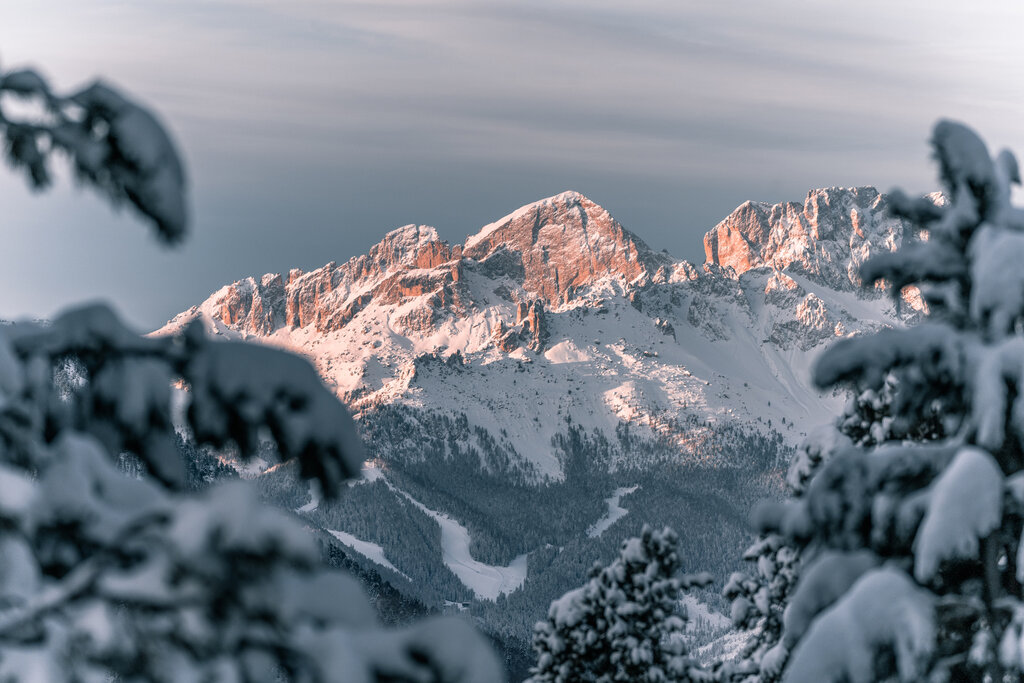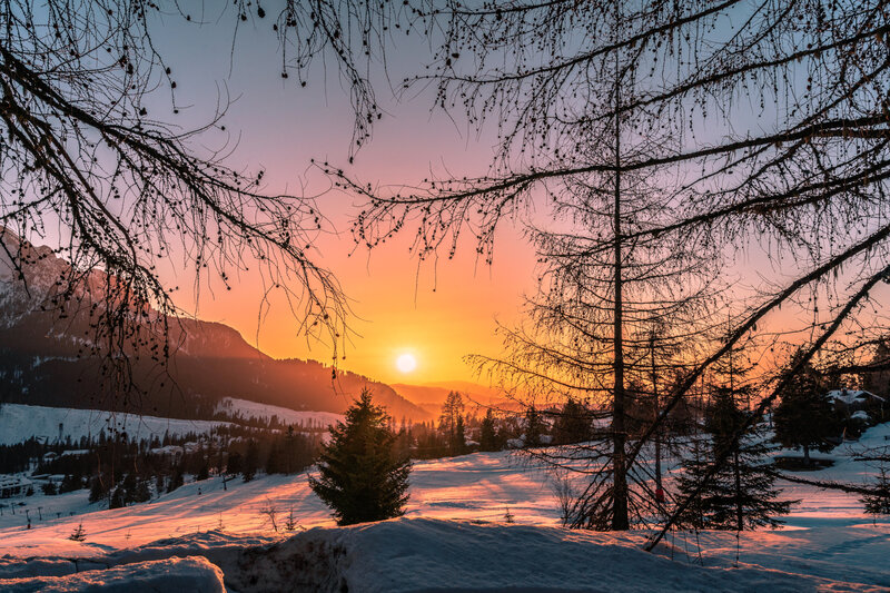 Die "Enrosadira" ist mehr als nur ein Sonnenuntergang. Sie ist eine Explosion von Farben, die den Himmel erleuchten und sich in den schneebedeckten Dolomiten widerspiegeln. Es ist die Magie, ein unvergessliches Naturerlebnis zu teilen - vielleicht bei einer geführten Wanderung durch verschneite Wälder.