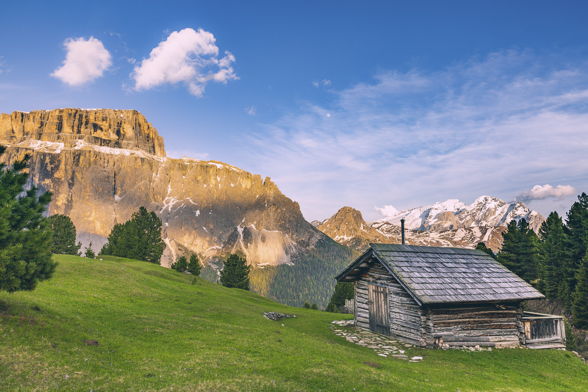 Das malerische Zentrum von Canazei ist zwar sehr leicht zu erreichen, aber man kann auch in einem der zahlreichen Unterkünfte am Passo Sella übernachten.