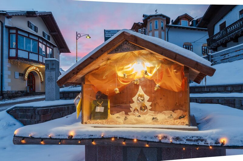 Vigo is just as you imagine it when you think of a picturesque mountain village. Small and quiet, it welcomes you with a warm and intimate atmosphere, where time seems to stand still. Its traditions are still alive, reflected both in the "tobiè" - the traditional wooden farmhouses - and in the rhythm of life of the inhabitants. Every corner of Vigo tells a story: its historic quarters, such as "San Giovanni" ("Pieve"), "Costa", "Larcioné", "Valongia" and "Tamion", are connected by ancient streets, where women once gathered around the wash-houses to do laundry and chat, while the farmers fed their animals. And it is precisely along these streets that, during the Christmas period, you will find around 20 handcrafted nativity scenes, the result of the commitment and creativity of local individuals, sculptors and associations. The scenes of the Nativity, set up with care and love on the fountains, can be visited from 5 December to 6 January, and the most magical time to admire them is at sunset, when the little lights are lit and the atmosphere becomes enchanted.